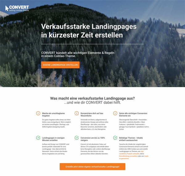 Tausche die Inhalte der vorgefertigten Conversion-Elemente einfach und schnell mittels des CMS Contao aus und erstelle Landingpages zu Themen, wie App vorstellen, Produkt verkaufen, deine Dienstleistung vermarkten oder um Leads zu generieren.